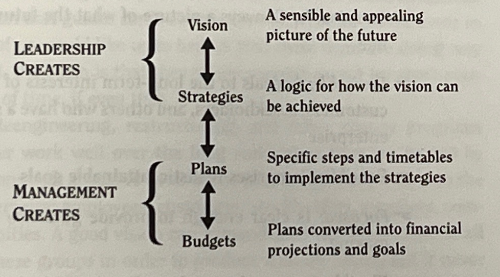 Note how Kotter defines the difference between management and leadership. Management’s goal is to bring order and predictability to a chaotic situation. It is about keeping the current system running efficiently, meeting targets, and producing reliable results (like consistent product quality). Leadership’s goal is improvement. It is about navigating the organization through turbulent times to a new, better future.